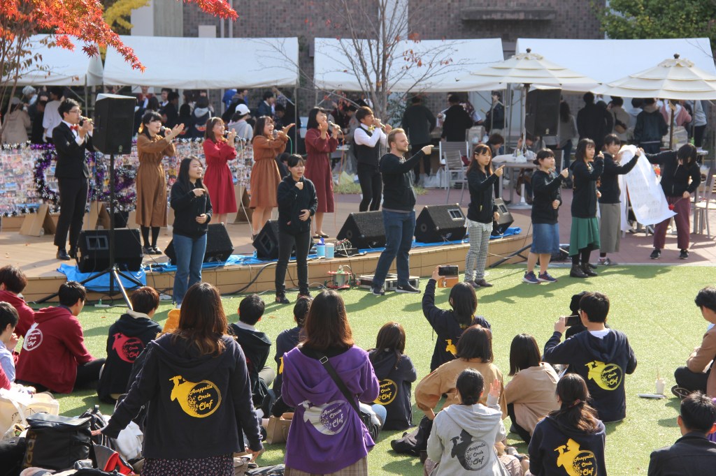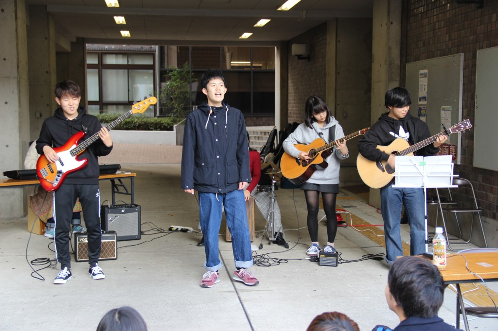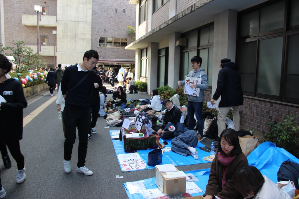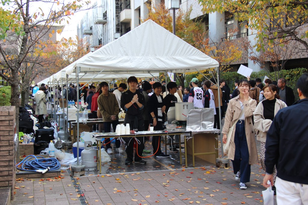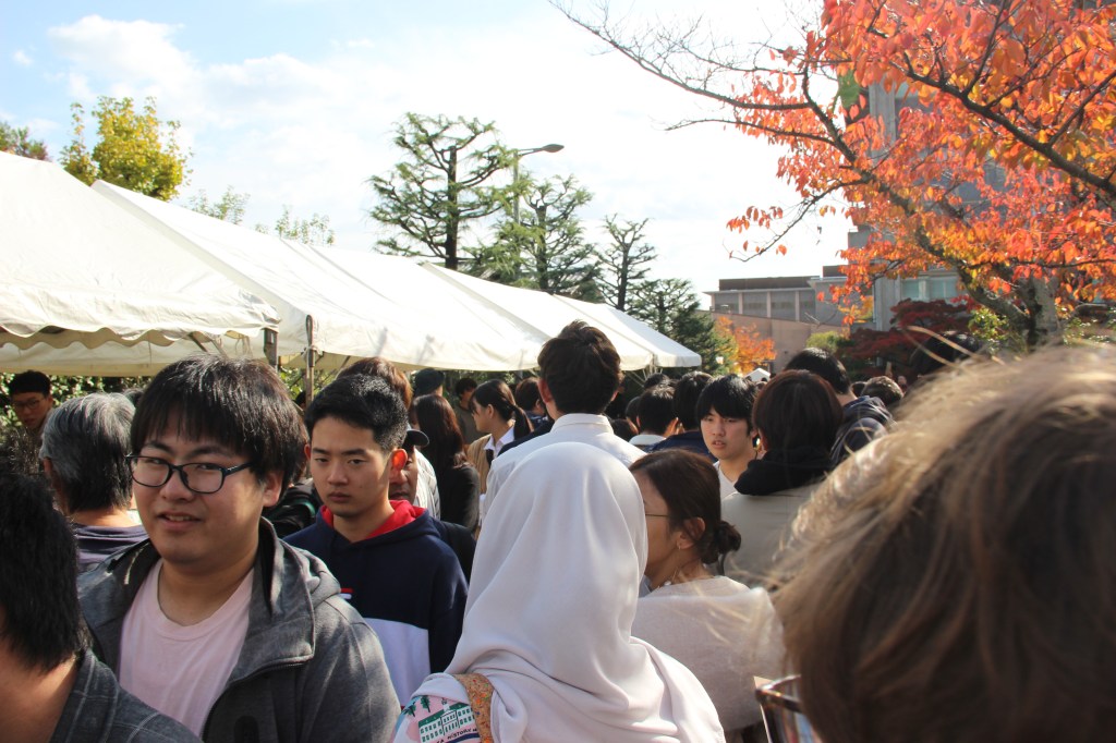 Aber genug davon – ich wollte auch noch von unserem Campus-Festival erzählen: Dieses fand letzten Sonntag statt und hatte sehr viel zu bieten. Zunächst waren wir etwas überfordert, denn die Sekunde, in der wir unseren Fuß auf das Campusgelände setzten wurden wir von allen Seiten nahezu angeschrien. Nicht weil wir etwas falsch gemacht hatten, sondern weil alle uns dazu bewegen wollten an ihrem Stand etwas zu essen zu kaufen. Jeder Club an der Uni hatte mindestens einen Stand. Alle verkauften Essen, um etwas Geld für die Gruppe zu sammeln. Manche Clubs hatten zudem noch Auftritte. Für diese Auftritte wurden mehrere Bühnen errichtet. Die Größte war sogar mit einem Spezialeffekten ausgestattet: Feuer. Das kam erstaunlicherweise zum Einsatz als der Kalligrafie-Club seine Show darbot… Ich muss sagen, ich wusste nicht, dass man mit Kalligrafie überhaupt einen Auftritt auf einer Bühne haben kann und noch dazu einen so dynamischen! Halb zu schneller Popmusik tanzend, schrieben sie da also voller Elan und teilweise fast schon aggressiv etwas auf große Leinwände und zwischendurch wurde ab und an Feuer vom Dach der Bühne in die Luft geschossen. Leider kann ich keine Videos auf WordPress hochladen, ohne etwas zu bezahlen. Das Feuer habe ich aber leider eh nicht erwischt. Nehmt einfach meine Worte und malt euch ein Bild im Kopf, so wie die Studierenden die japanischen Zeichen auf die Leinwand. 😉