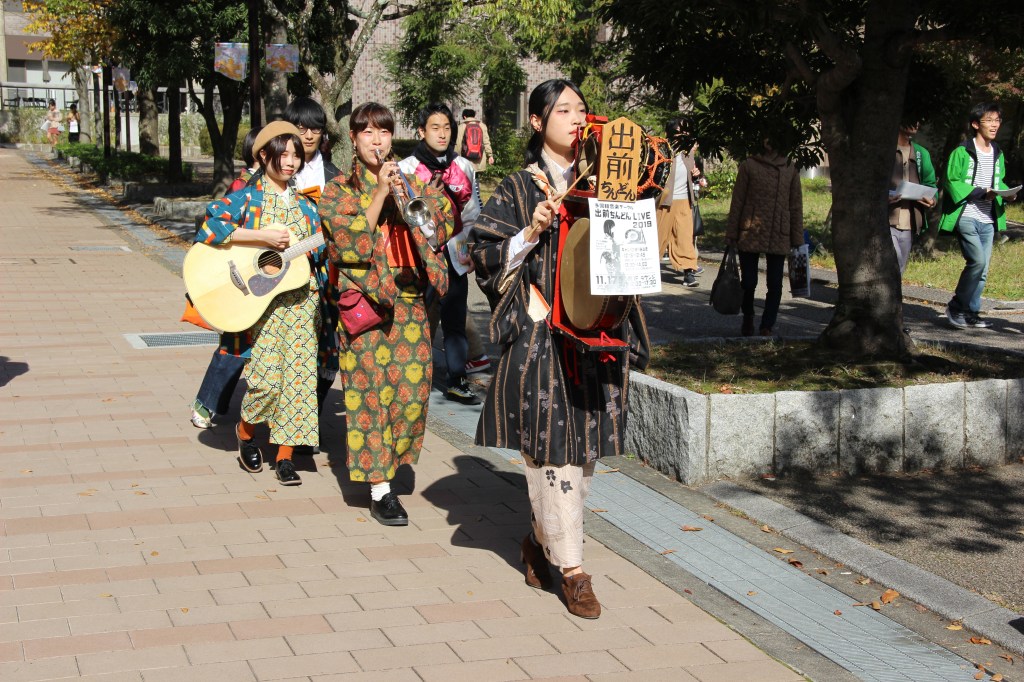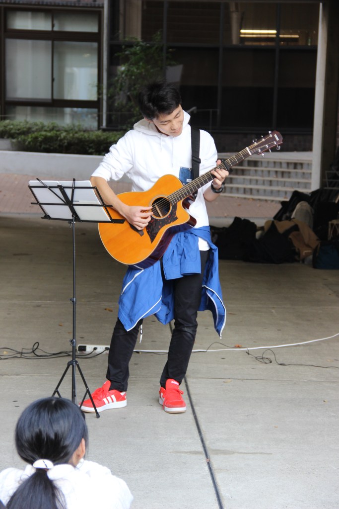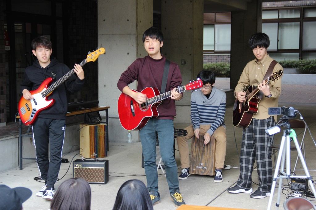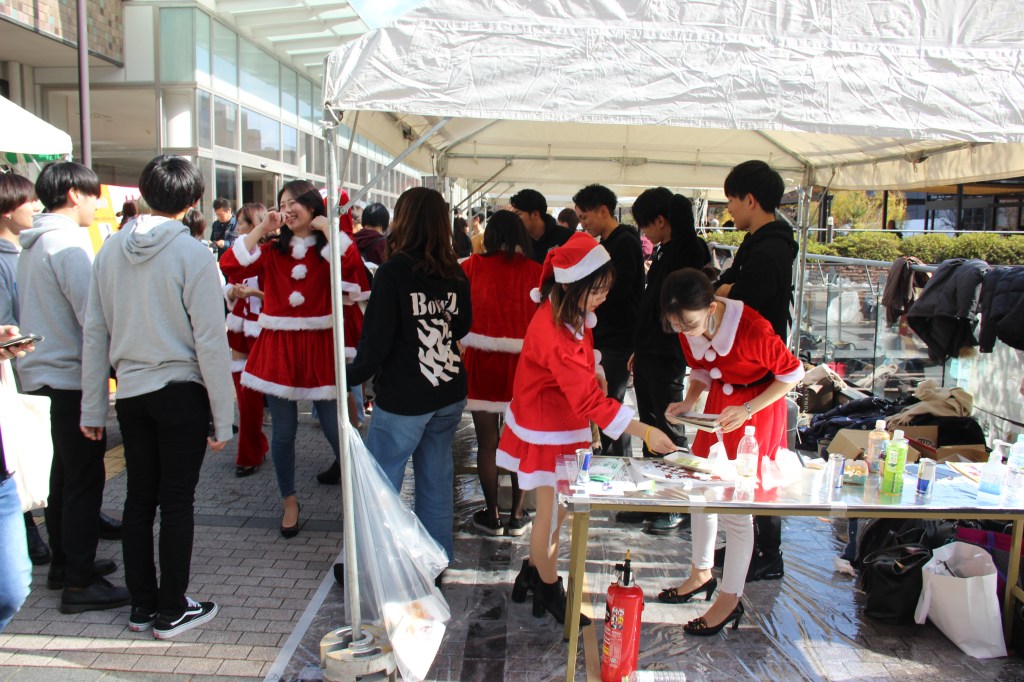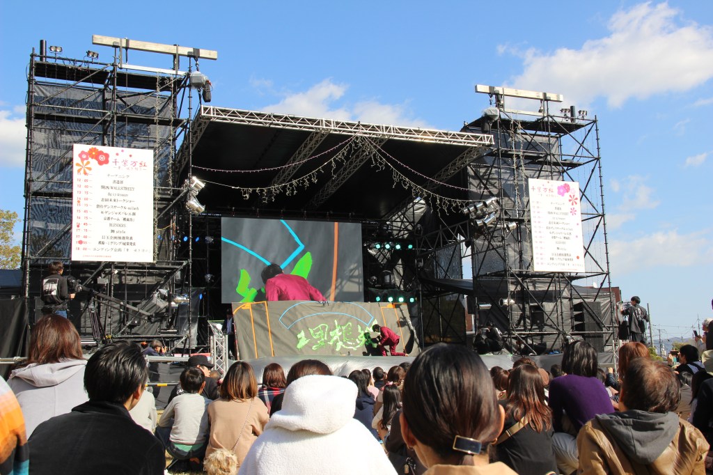 Aber genug davon – ich wollte auch noch von unserem Campus-Festival erzählen: Dieses fand letzten Sonntag statt und hatte sehr viel zu bieten. Zunächst waren wir etwas überfordert, denn die Sekunde, in der wir unseren Fuß auf das Campusgelände setzten wurden wir von allen Seiten nahezu angeschrien. Nicht weil wir etwas falsch gemacht hatten, sondern weil alle uns dazu bewegen wollten an ihrem Stand etwas zu essen zu kaufen. Jeder Club an der Uni hatte mindestens einen Stand. Alle verkauften Essen, um etwas Geld für die Gruppe zu sammeln. Manche Clubs hatten zudem noch Auftritte. Für diese Auftritte wurden mehrere Bühnen errichtet. Die Größte war sogar mit einem Spezialeffekten ausgestattet: Feuer. Das kam erstaunlicherweise zum Einsatz als der Kalligrafie-Club seine Show darbot… Ich muss sagen, ich wusste nicht, dass man mit Kalligrafie überhaupt einen Auftritt auf einer Bühne haben kann und noch dazu einen so dynamischen! Halb zu schneller Popmusik tanzend, schrieben sie da also voller Elan und teilweise fast schon aggressiv etwas auf große Leinwände und zwischendurch wurde ab und an Feuer vom Dach der Bühne in die Luft geschossen. Leider kann ich keine Videos auf WordPress hochladen, ohne etwas zu bezahlen. Das Feuer habe ich aber leider eh nicht erwischt. Nehmt einfach meine Worte und malt euch ein Bild im Kopf, so wie die Studierenden die japanischen Zeichen auf die Leinwand. 😉